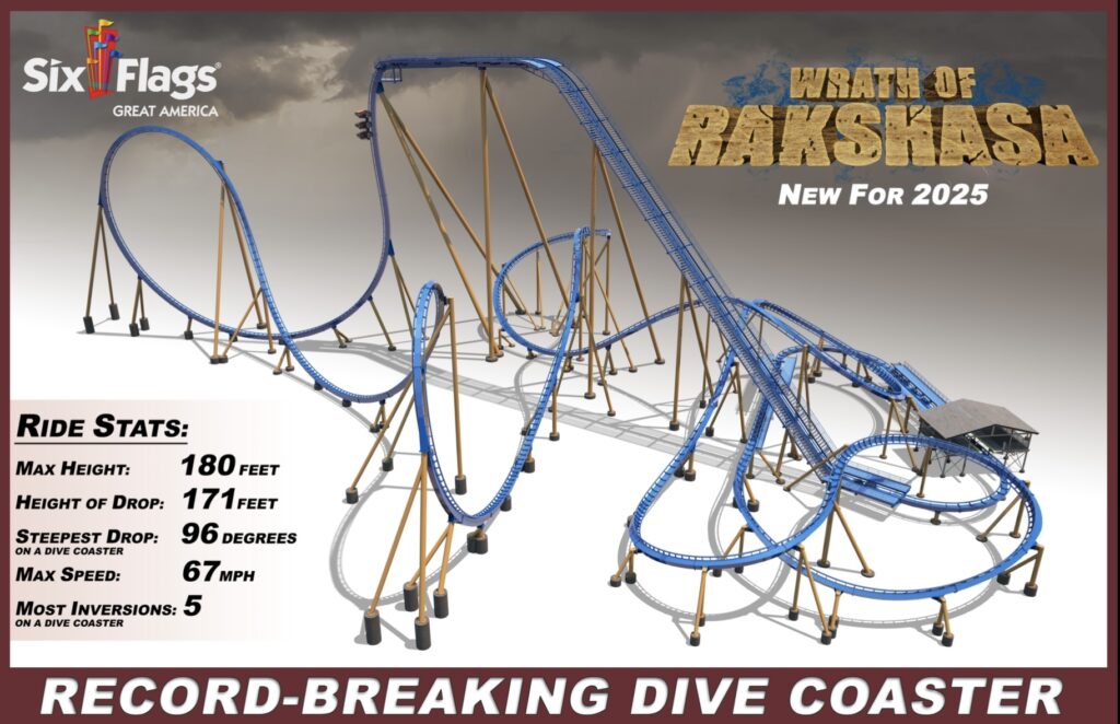 “Six Flags Great America continues to push the limits of innovation and thrills, as we introduce the world’s steepest drop with the most inversions on a dive coaster,” said John Krajnak, Park President. “Wrath of Rakshasa joins our already impressive lineup of record-breaking roller coasters and attractions at the park, demonstrating our commitment to delivering cutting-edge experiences for our guests.”