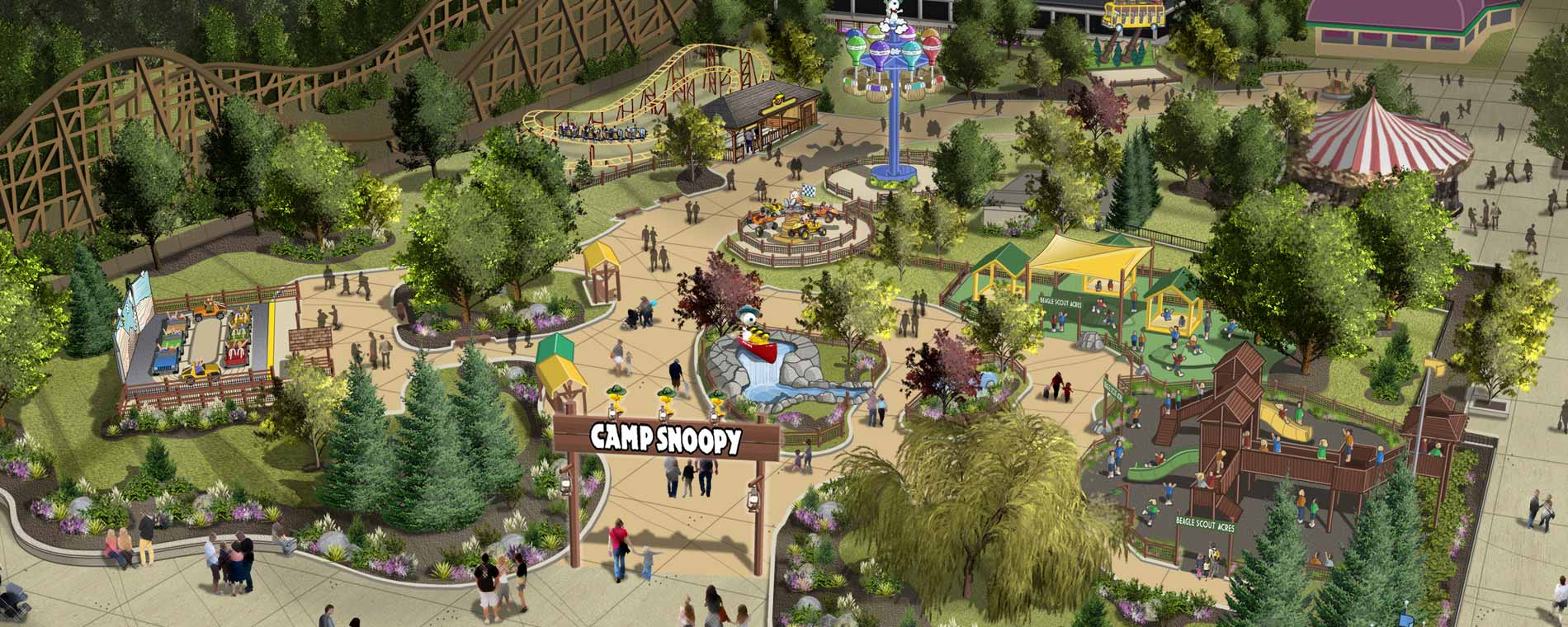 In addition, the new Beagle Scout Acres will feature a large climb-and-play structure with lots of interactive features and things to climb. Michigan’s Adventure will join Carowinds, Cedar Point, and Knott’s Berry Farm as parks in the Cedar Fair family with a Camp Snoopy Kids area.