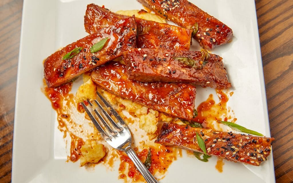 - Sweet and Sour Sticky Ribs: Philippine-inspired smoked pork ribs tossed in a sweet and sour sauce, served over goat cheese polenta and topped with toasted sesame seeds