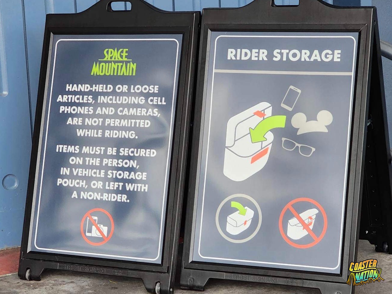 New signage has been put in place at Walt Disney World banning loose articles while riding Space Mountain. Any handheld items, loose articles, as well as as phones and cameras are now required to be stored during the duration of the ride, in either a bag or the pouch attached to the ride vehicle.