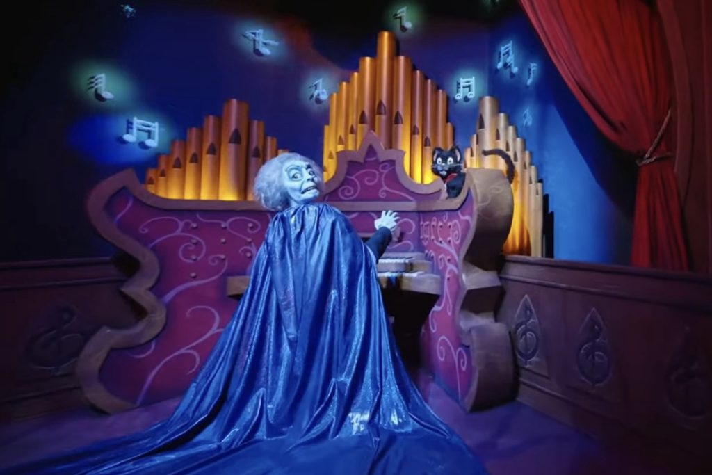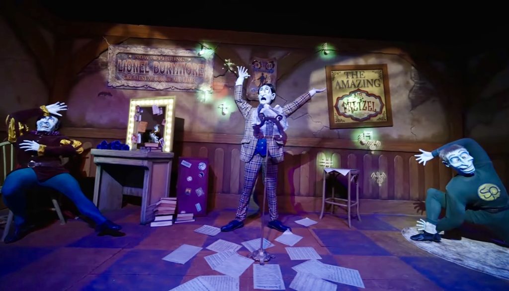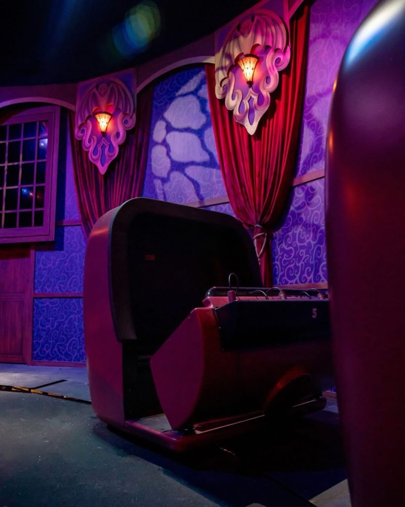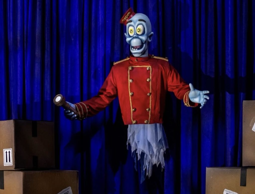 Guests enter the haunted theater on a stormy night, where a lightning strike unleashes mischievous “ghost notes” from Maestro’s pipe organ. Riders join head usher No Legs Larry’s crew, boarding enchanted opera boxes equipped with interactive flashlights to capture the runaway spirits.
