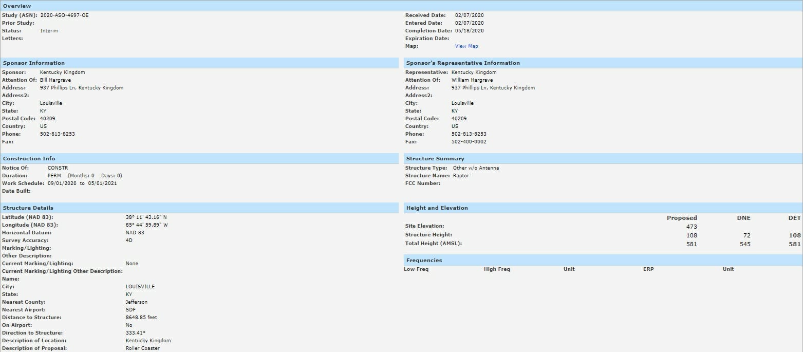 With the current pandemic, many parks are altering future plans to deal with the financial aftermath of COVID-19. It seems that the RMC Raptor project at Kentucky Kingdom has been terminated and is not moving forward. All documents submitted to the FAA for the coaster have been removed, a move seen with other cancelled projects such as California’s Great America’s canceled hyper coaster.