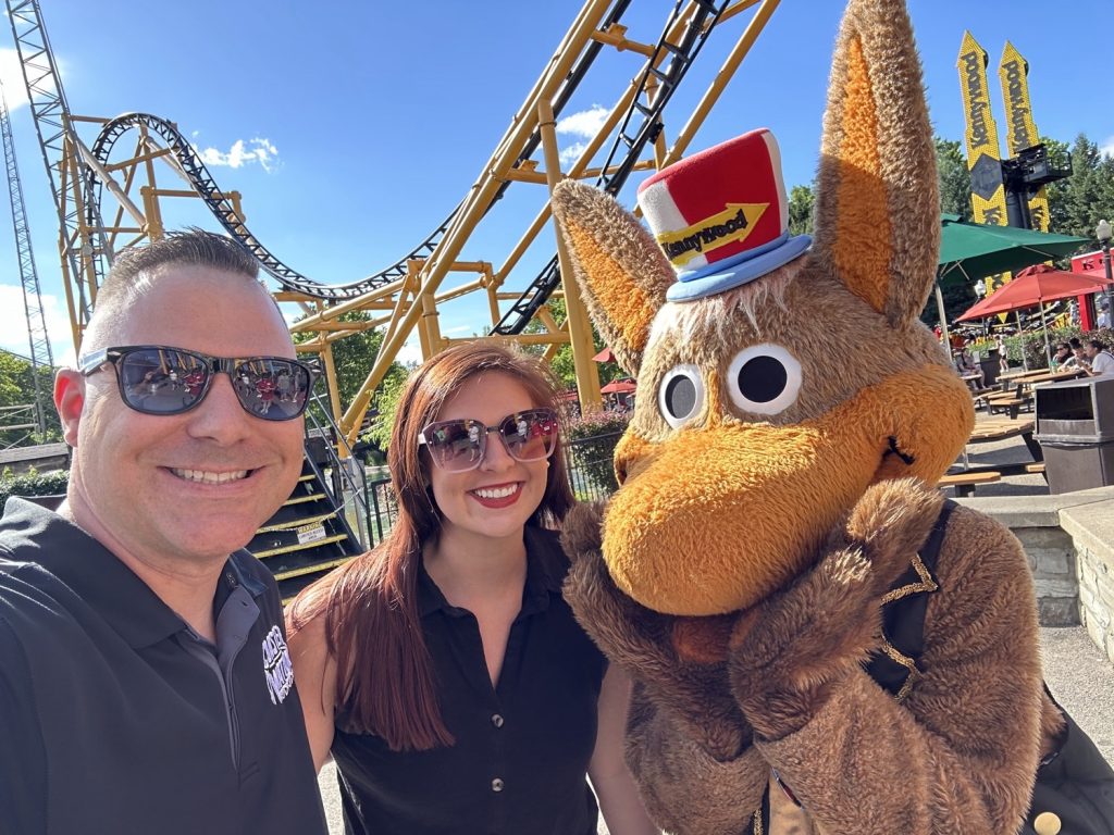 Dan Hower & Alyssa Schipani take a selfie with Kenny Kangaroo. Coasternation.com.