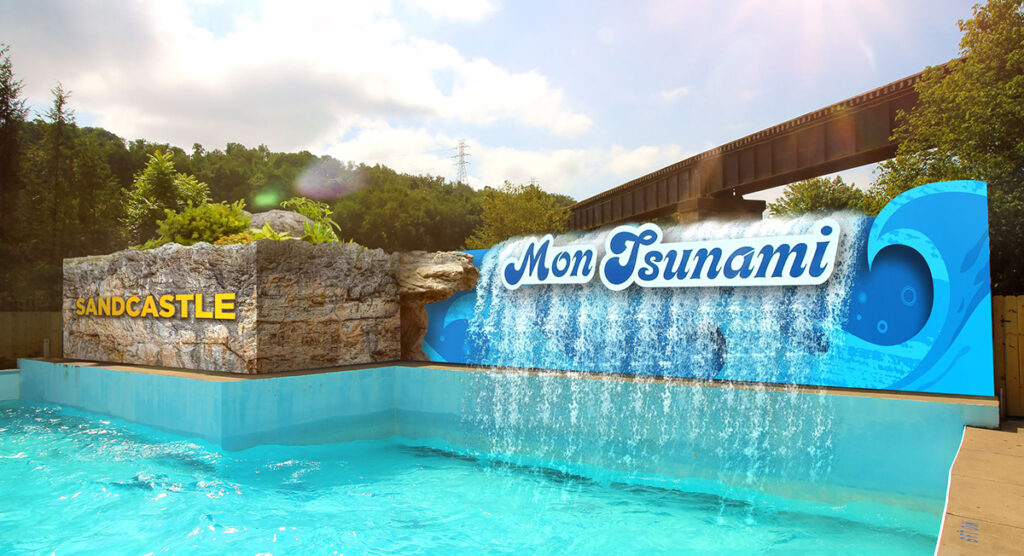 - Mon Tsunami Wave Pool – A new stone façade creates an illusion of rocky cliffs, while a new waterfall feature cascades below during wave sequences.