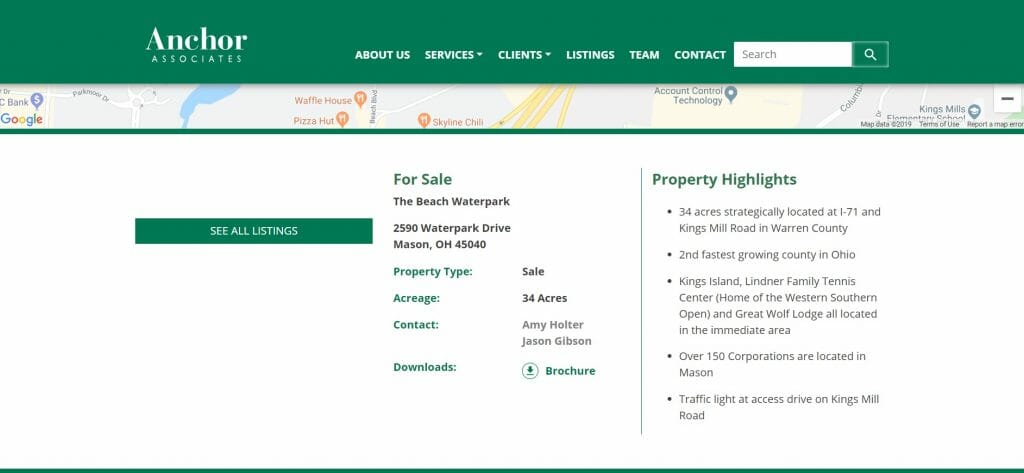 This listing was posted on Anchor Associates was for the 34 acres the park sits on. The nature of the listing indicates that it is the land being sold. Even though the sale listing includes information and diagrams for the waterpark, the emphasis on traffic and nearby residential communities implies that this plot may be used for commercial development.