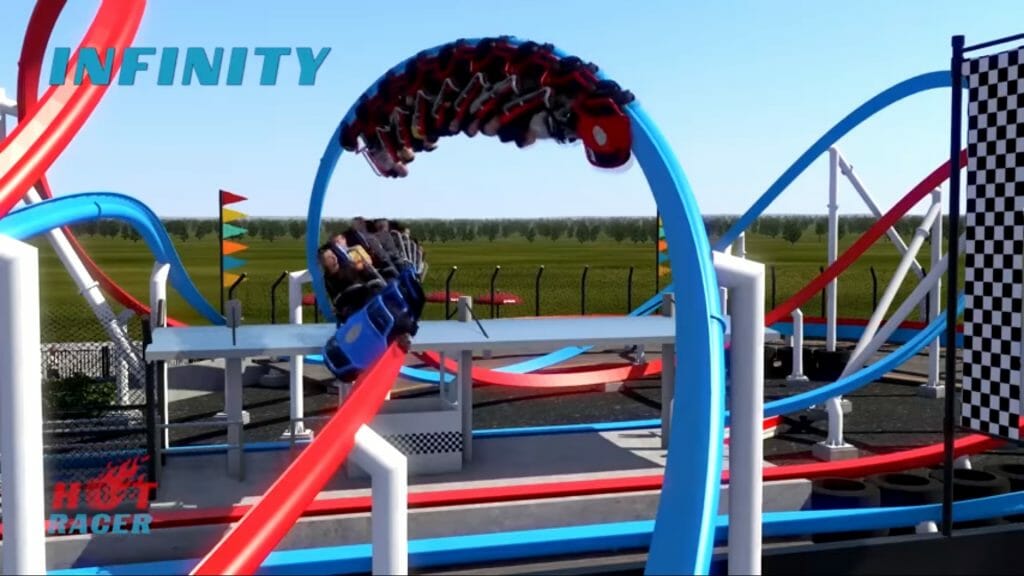 The videos released today showed a compilation of potential layouts. The Infinity features 330 meters of twisted intertwining track and is touted as the world’s most compact racing coaster. A unique feature of this ride is the first double 360 degree roll vs s hump element.