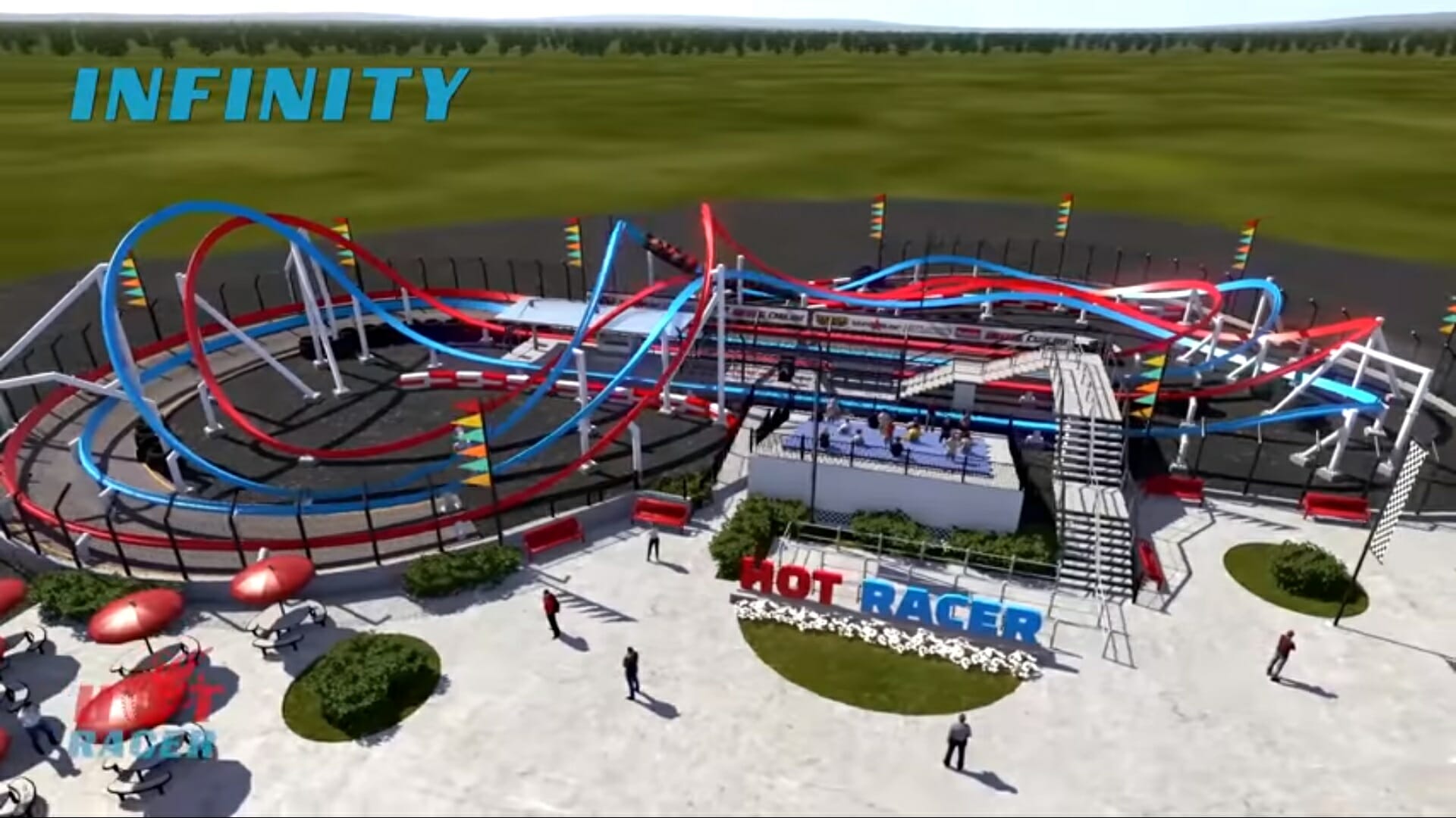 The videos released today showed a compilation of potential layouts. The Infinity features 330 meters of twisted intertwining track and is touted as the world’s most compact racing coaster. A unique feature of this ride is the first double 360 degree roll vs s hump element.
