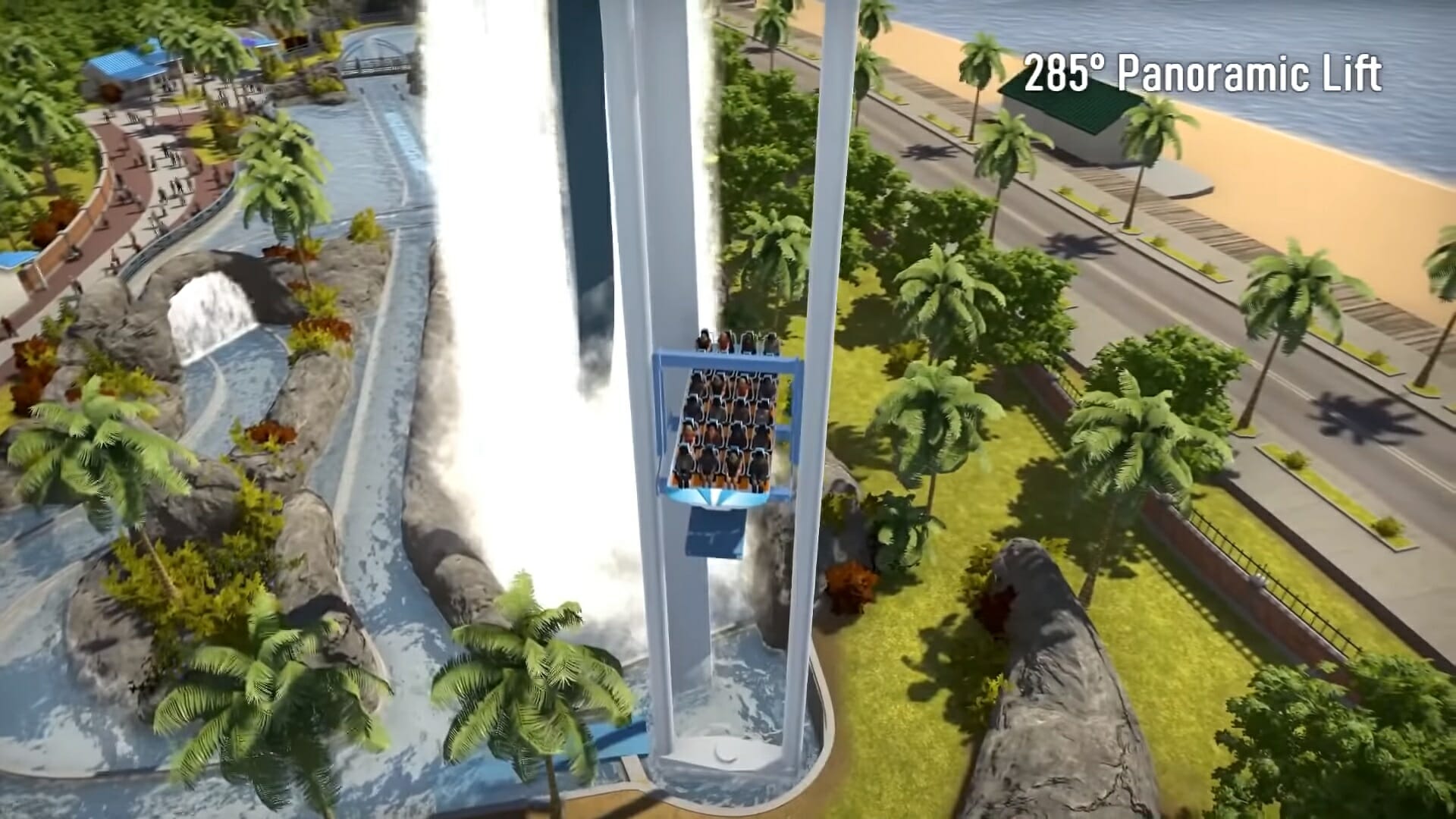 The first concept is a combination of a shuttle and water coaster. Cars consisting of 24 riders are launched back and forth between two spires. After reaching the apex, the cars will splash into a pool of water, soaking the riders.